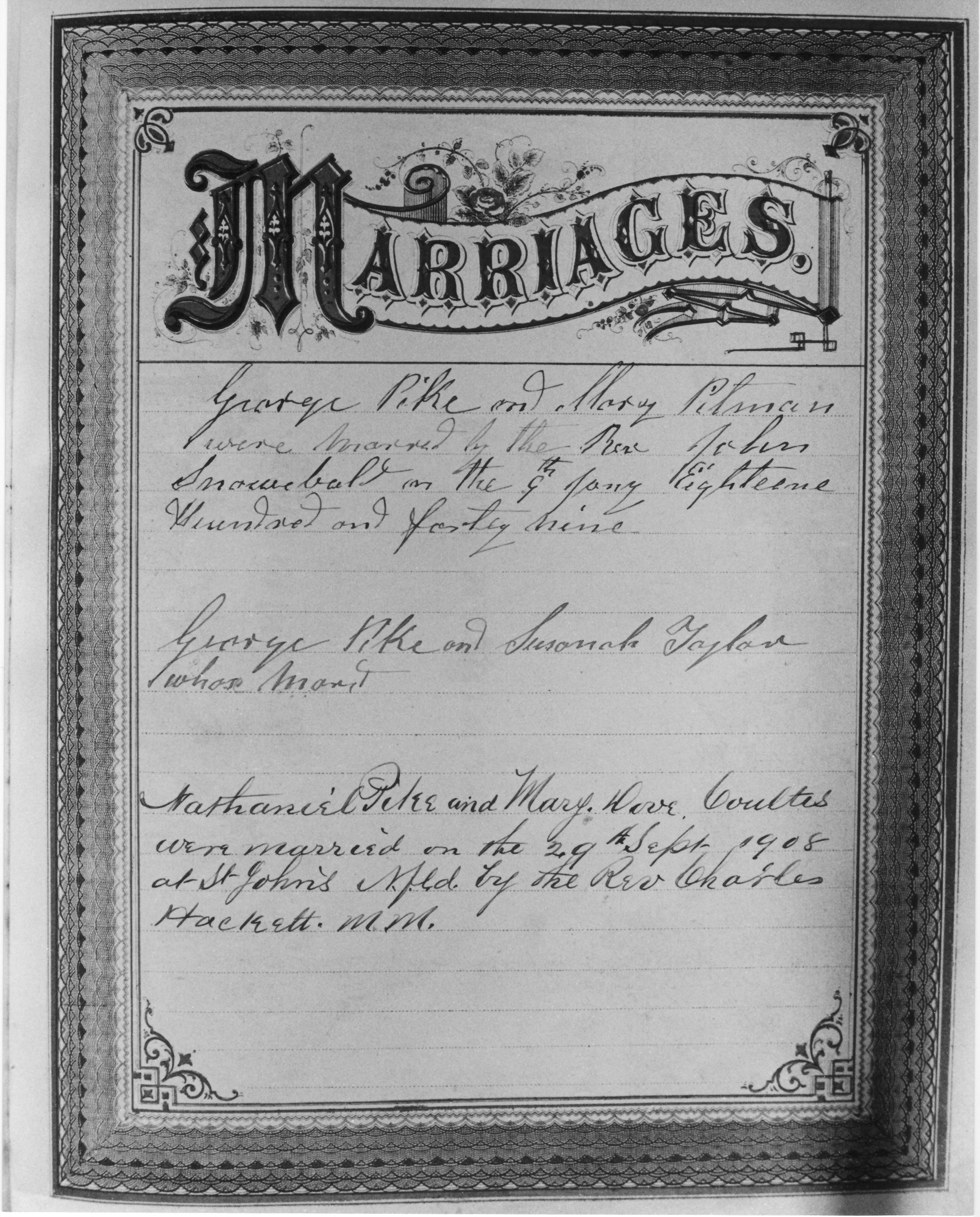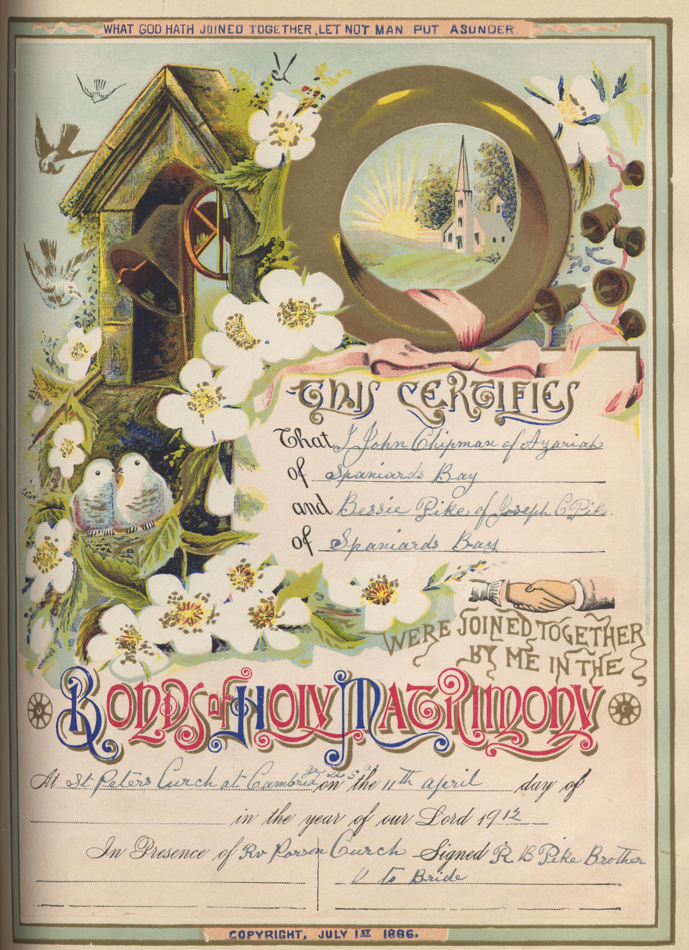 - A marriage record between John Chipman and Bessie Pike, both of Spaniard's Bay,
