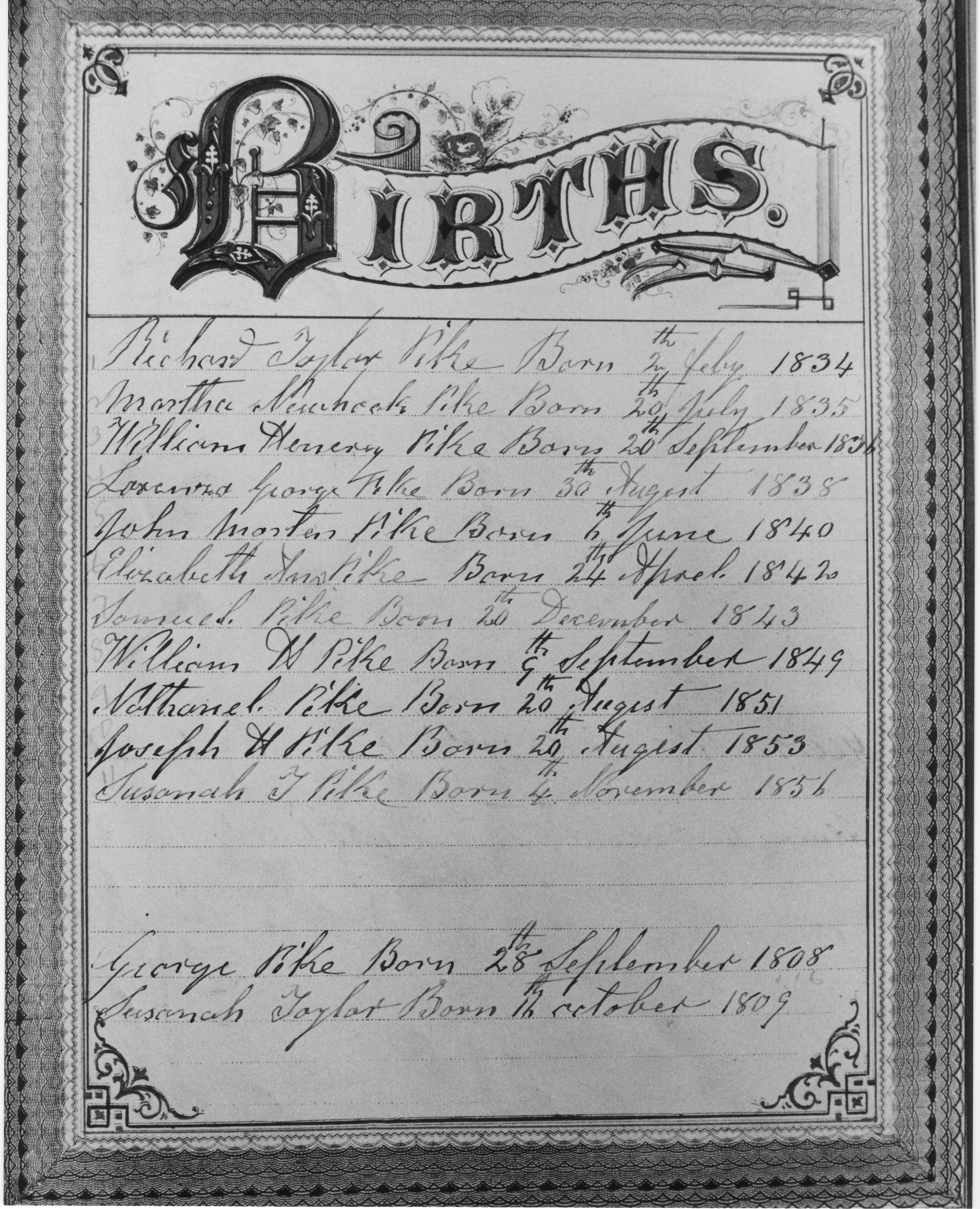 Also recorded are the births of the children of Nathaniel's father George Pike, information on marriages and deaths,