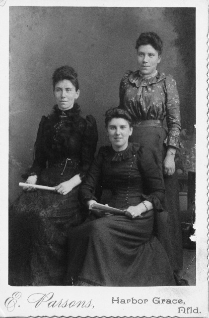 - three young women in a photo taken by E.Parsons of Harbour Grace.